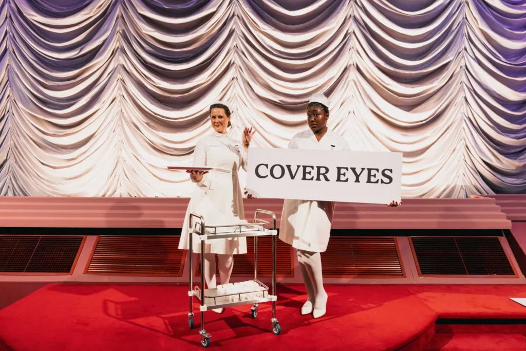 Meanwhile, Safe Mode offered a gentler journey. Guests were welcomed by cheerful ushers and the upbeat sounds of 1960s teen pop. Wrapped in cozy blankets and armed with survival packs, they were guided to plush seating while “nervous nurses” dispensed calming tonics and breathing tips — ideal for those who prefer their horror with a side of serenity.